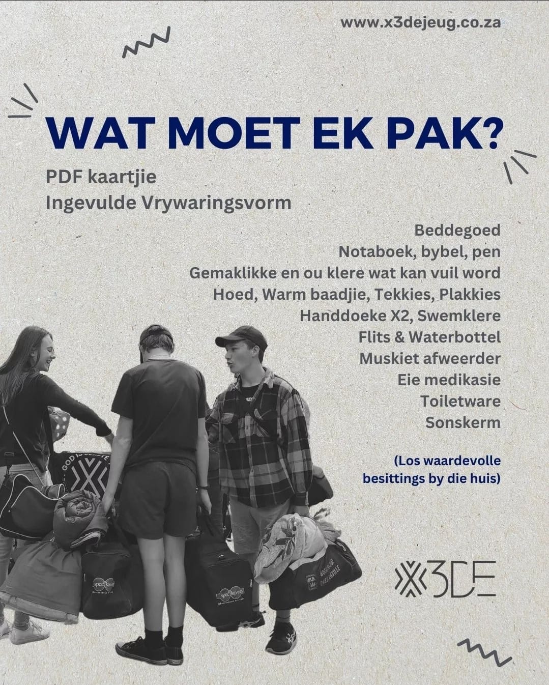 Indien u nie die epos ontvang het nie of enige vrae het, kontak ons gerus by hallo@x3dejeug.co.za, via WhatsApp op 064 087 6376, of skakel ons direk op die selfde nommer.