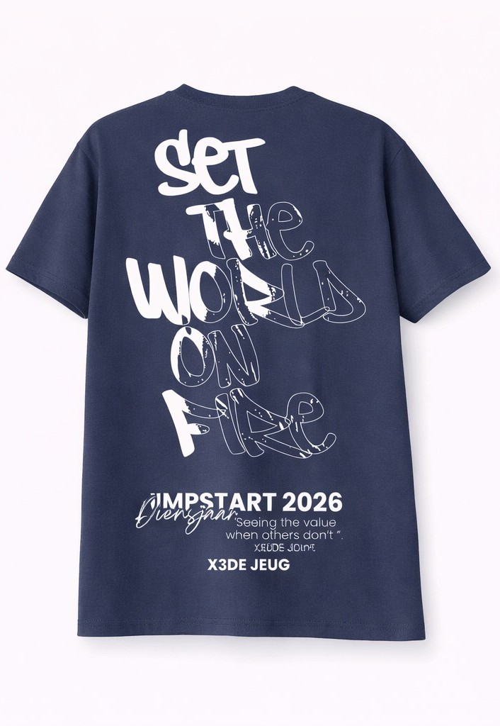 A navy tee with a graffiti-style back print that stands out without trying too hard. The front is clean with a small chest stamp graphic, and the back delivers the main message: SET THE WORLD ON FIRE, with JUMPSTART 2026 branding.